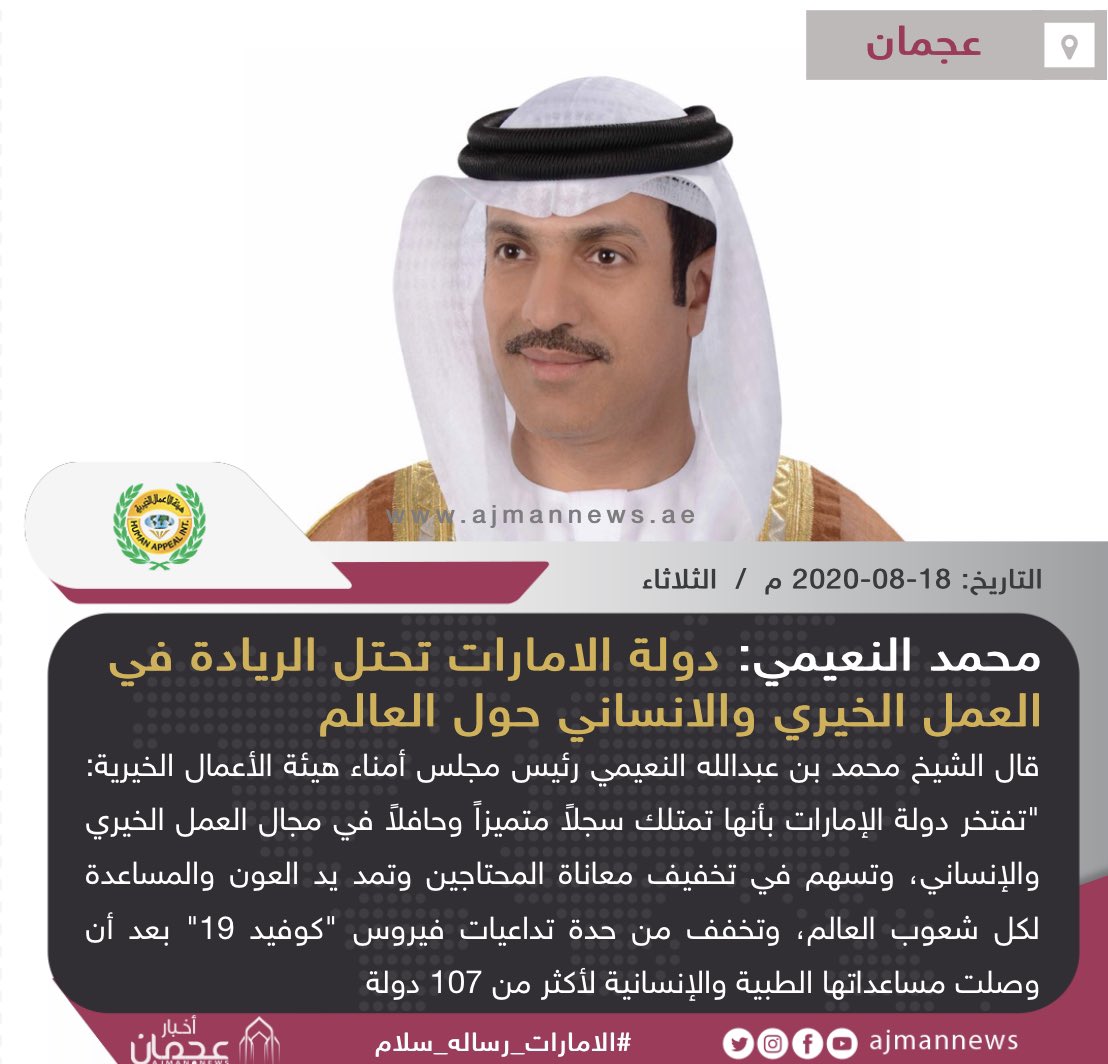 أخبار عجمان محمد النعيمي دولة الامارات تحتل الريادة في العمل الخيري والانساني حول العالم أخبار عجمان الإمارات هيئة الأعمال الخيرية عجمان الامارات رساله سلام