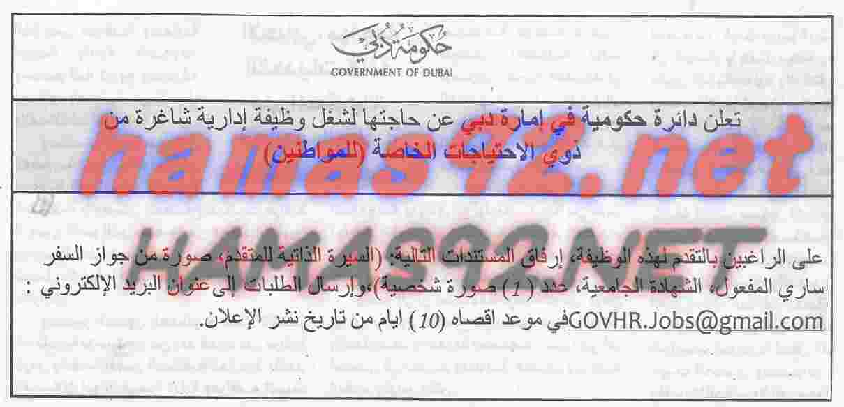 اعلان وظائف جهة حكومية في دبى للمؤهلات العليا منشور بجريدة الخليج الاماراتية 30 08 2016