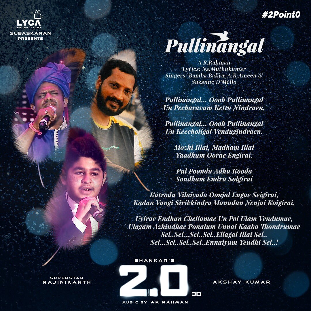 2 0 On Twitter Pullinangal Ooh Pullinangal Un Pecharavam Kettu Nindraen Lyrics Penned By Late Na Muthukumar Which Touches Our Soul With Its Soothing Melody Amazing Vocals 2point0 Rajinikanth Akshaykumar Iamamyjackson Shankarshanmugh
