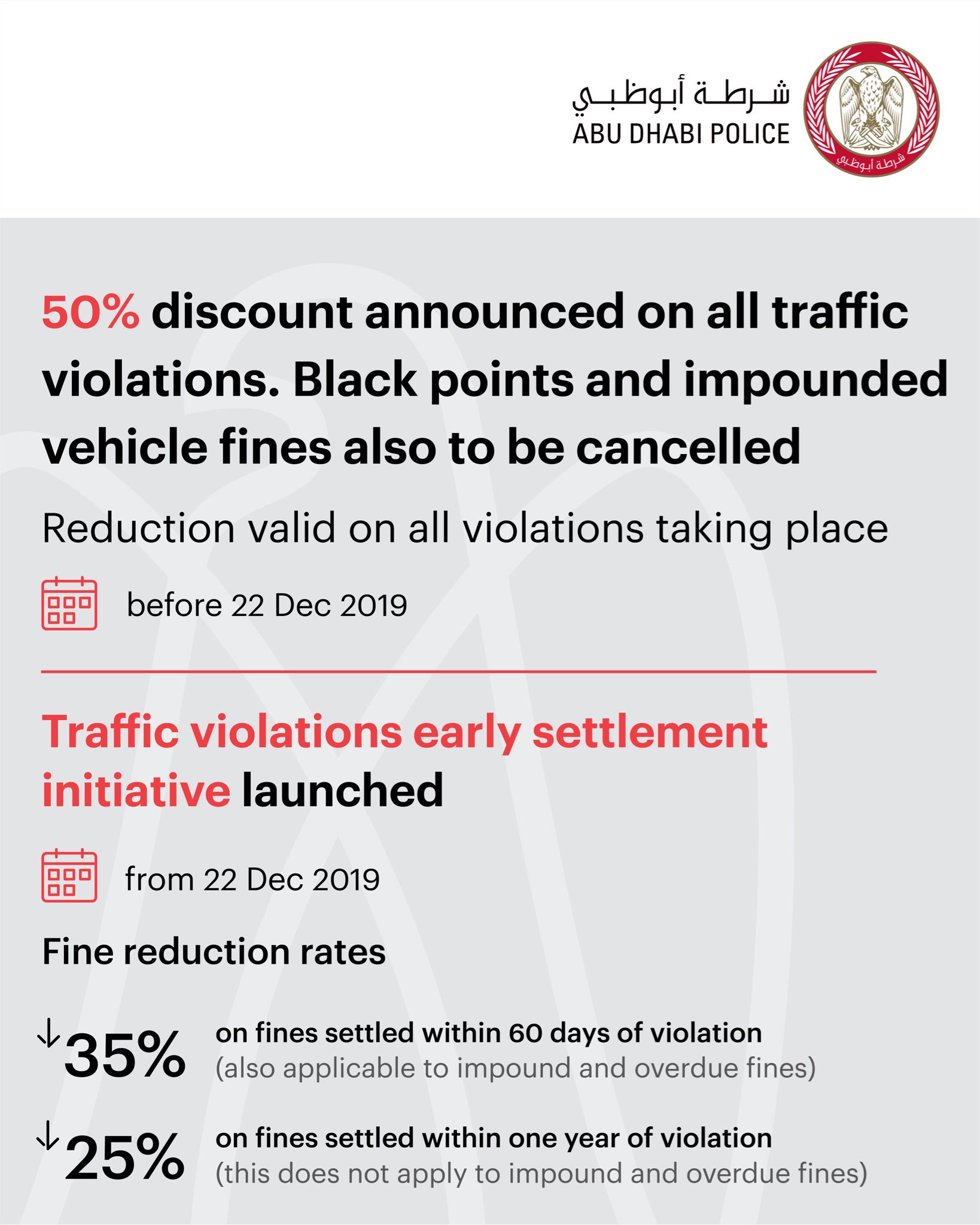 مكتب أبوظبي الإعلامي En Twitter Abu Dhabi Police Announces A 50 Discount On Traffic Violations And The Cancellation Of Impound Fees And Overdue Fines When Payment Is Made Within The Next Three