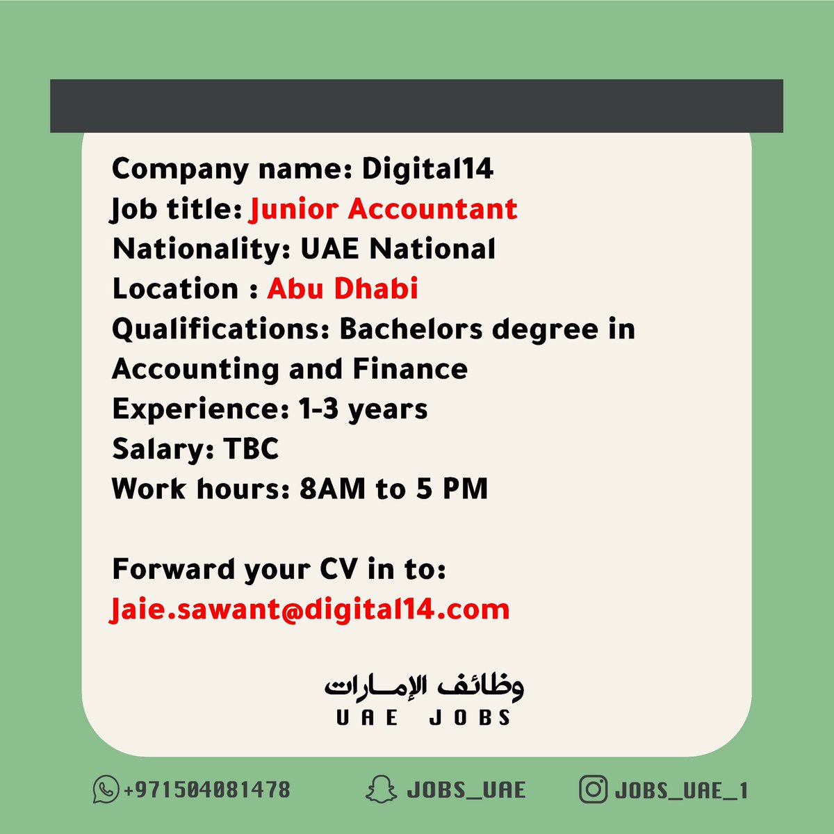 وظائف الإمارات On Twitter Company Name Digital14 Job Title Junior Accountant Nationality Uae National Location Abu Dhabi Qualifications Bachelors Degree In Accounting And Finance Experience 1 3 Years Salary Tbc Work Hours