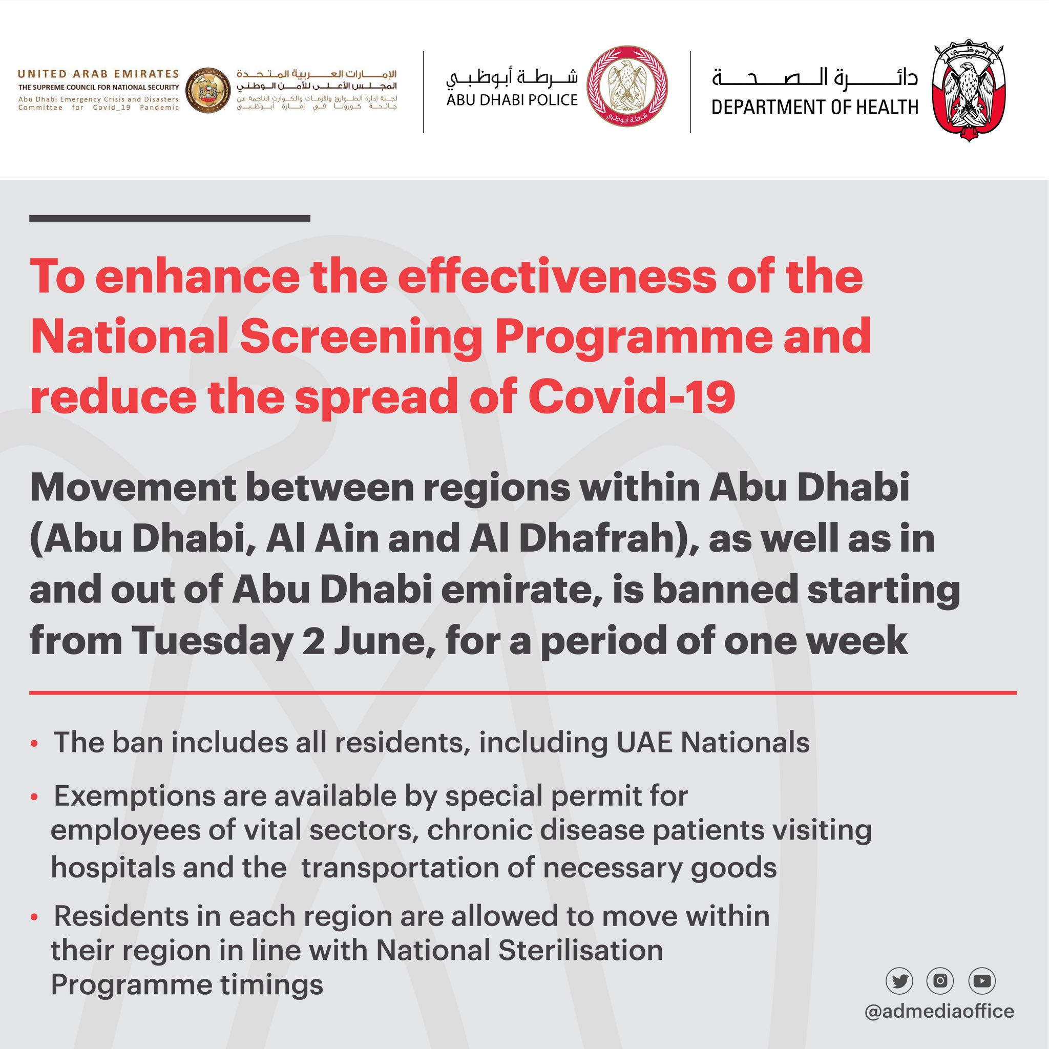 مكتب أبوظبي الإعلامي On Twitter Abu Dhabi Emergency And Crisis Committee For The Covid 19 Pandemic In Collaboration With Abu Dhabi Police And Doh Have Announced A Ban On Movement Entering Exiting