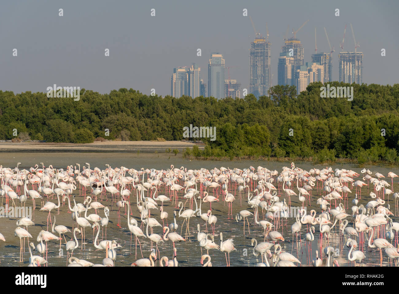 Ras Al Khor Creek In Dubai With Skyline A Flock Of Flamingoes Stock Photo Alamy