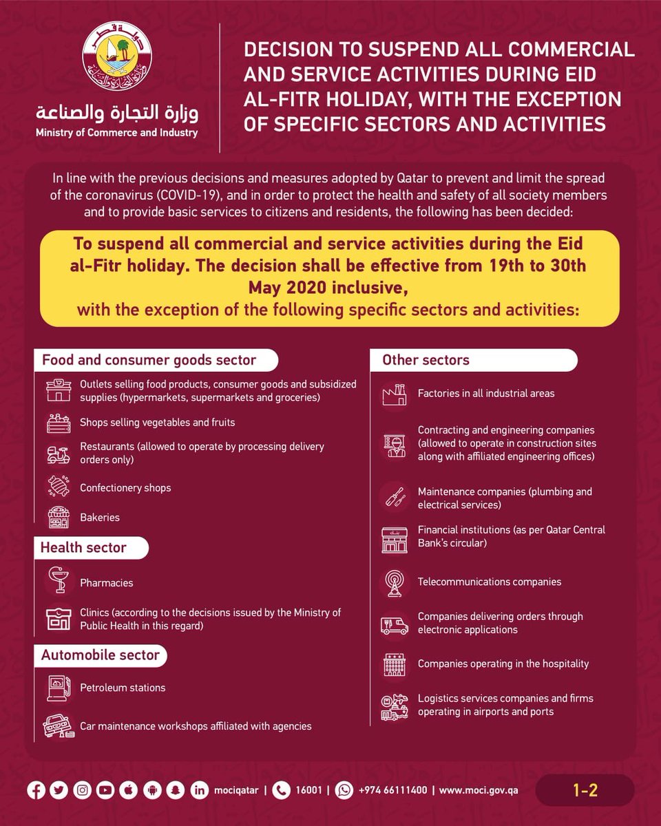 وزارة التجارة والصناعة On Twitter Decision To Suspend All Commercial And Service Activities During Eid Alfitr Holiday With The Exception Of Specific Sectors And Activities Qatar Yoursafetyismysafety Https T Co Bdxesleagc