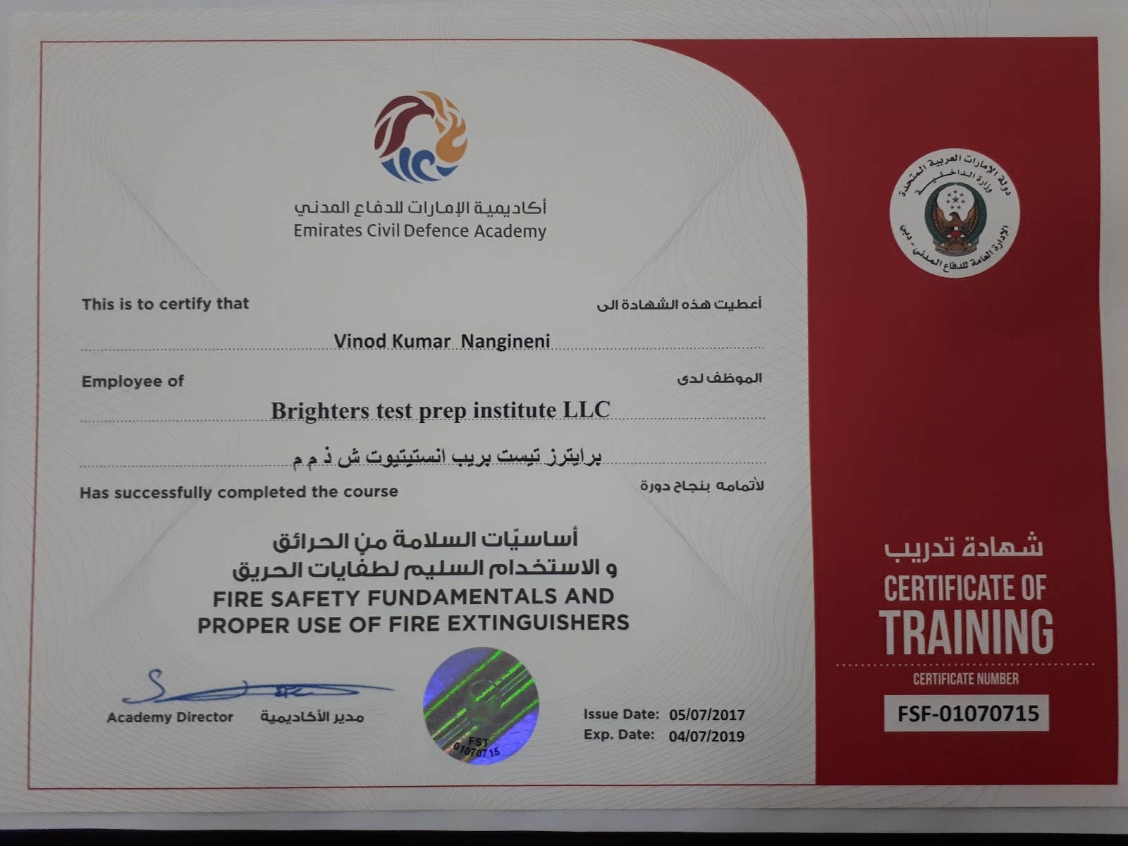 Emirates Civil Defence Academy Training Certificate