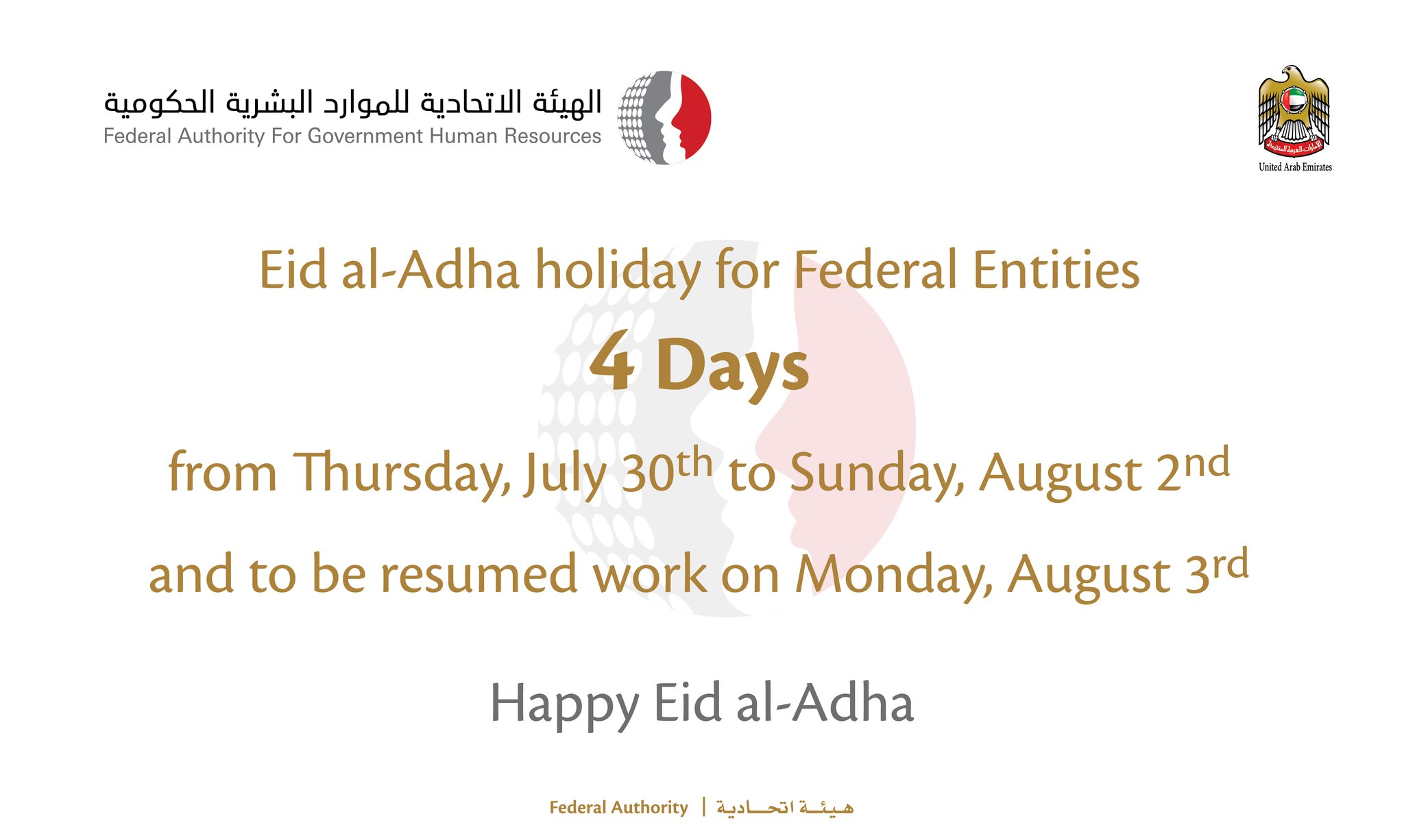 The uae federal authority for government human resources announced that eid al adha holidays for ministries and federal.