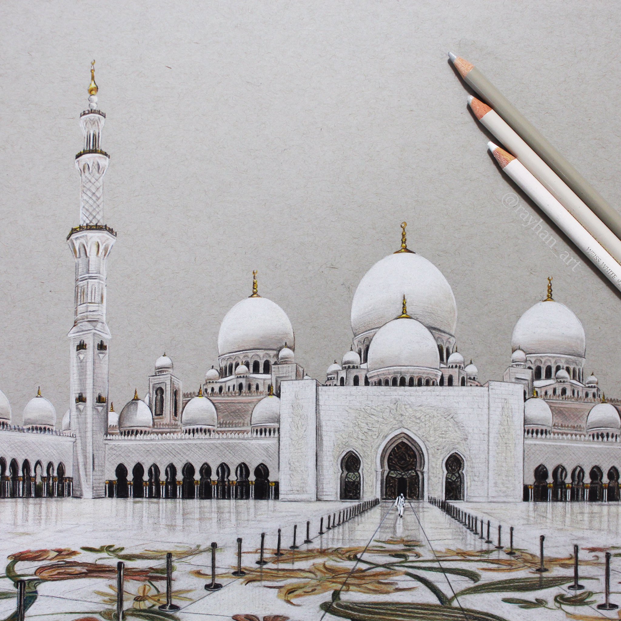 Love This Pencil Drawing Of Abu Dhabi S Spectacular Sheikh Zayed Grand Mosque By Uae Artist Mariama Mosque Art Perspective Drawing Architecture Mosque Drawing
